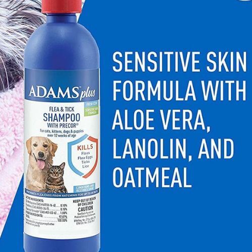Adams Plus Shampoo with Precor has a unique formula that is designed to kill fleas, ticks, and lice on contact. It helps to condition the skin and coat, removes dirt and dandruff, and leaves your pet's coat looking shiny and healthy.