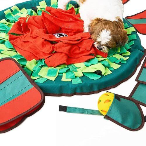 Fleece is one material among many which can meet these standards. However you choose to craft your snuffle mat—whether with fleece strips or something else—you should make sure it will provide fun yet safe entertainment for your pup.