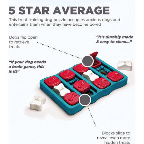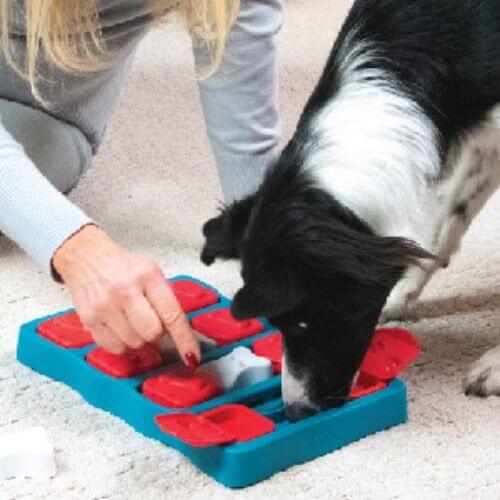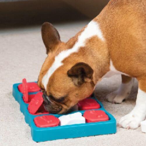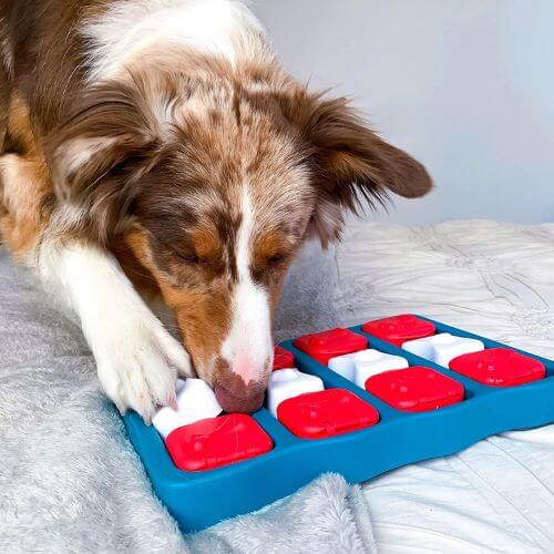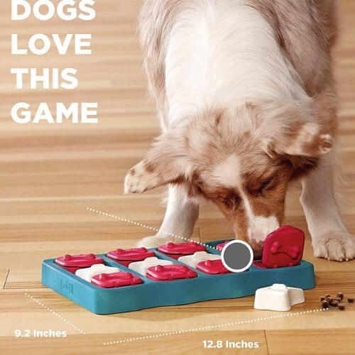 In this intermediate-level puzzle, some pieces must be removed before others can be slid across the board to reveal hidden treats. It allows dogs to utilize their paws and nose for exploration and problem-solving.