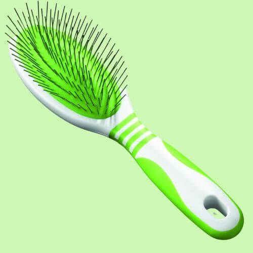 The pin brush is a grooming tool that is specially designed for dogs. It looks and works similar to a human hairbrush. It consists of thin, flexible wires with protective pins on the ends that are attached to a soft base pad. Pin brushes are often oval in shape and come with a handle, though some models may be designed to be held in the palm.