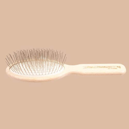 This oblong-shaped brush comes in 2 sizes, medium, and large. The pins are made of finely honed and polished stainless steel, allowing them to penetrate even the finest hair safely, and protect the dog's skin when grooming, making it safe even for the most fragile coats.
