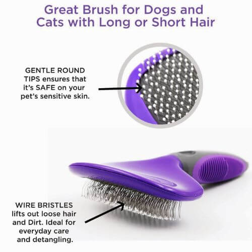 Its wire bristles are soft yet sturdy, leaving your pup with a glossy and smooth coat. Plus, each one of the tips is rounded so you can be sure that your pup’s skin is never compromised during brushing.